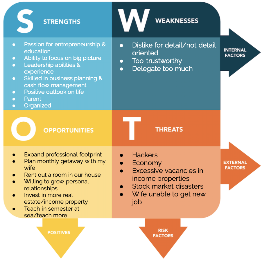 When it came to doing my personal SWOT, I had a harder time finding the right verbiage and listing my personal weaknesses. When it came time to doing my professional SWOT for my business, I definitely found it easier because it wasn’t so personal. I did rely on Tom for some input on my personal. Here is my personal AND professional SWOT. I did do two because it was helpful for me to have them separate.