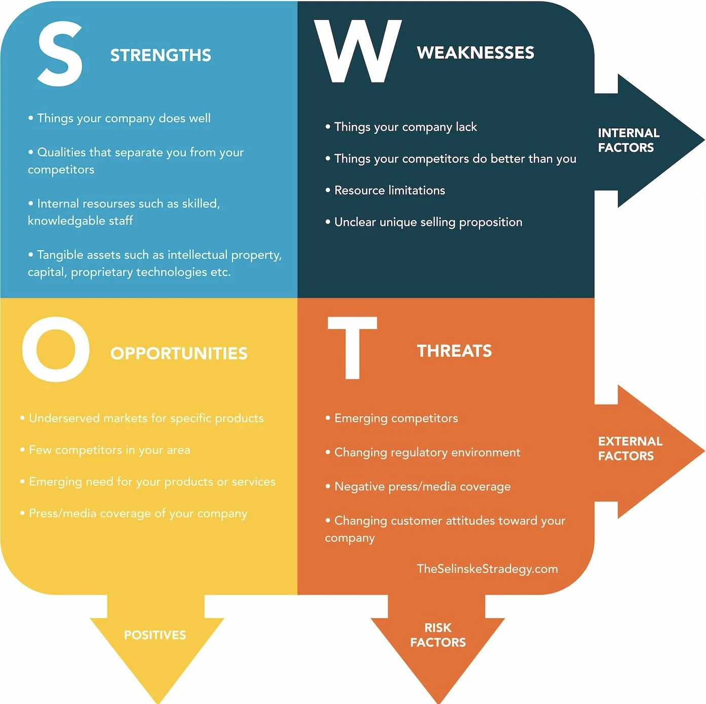 SWOT. It is all about strengths and weaknesses which should be viewed as internal ( you/ your business) and opportunities and threats which should be viewed as external (competing business/stock market). This is a SUPER helpful tool when examining you or your business. WHY, well personally if you don’t know what you’re good at, then how do you know how to be great at it? If you don’t know what your weaknesses are, how will you ever improve upon them? Professionally it is the same for businesses. If you don’t know your weaknesses and your competitor does, you will always come in behind them. Obviously not the desired outcome as a business owner.